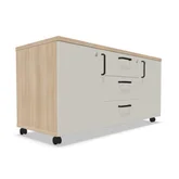 Изцяло затворен офис шкаф на колелца, две от които са със стопери.