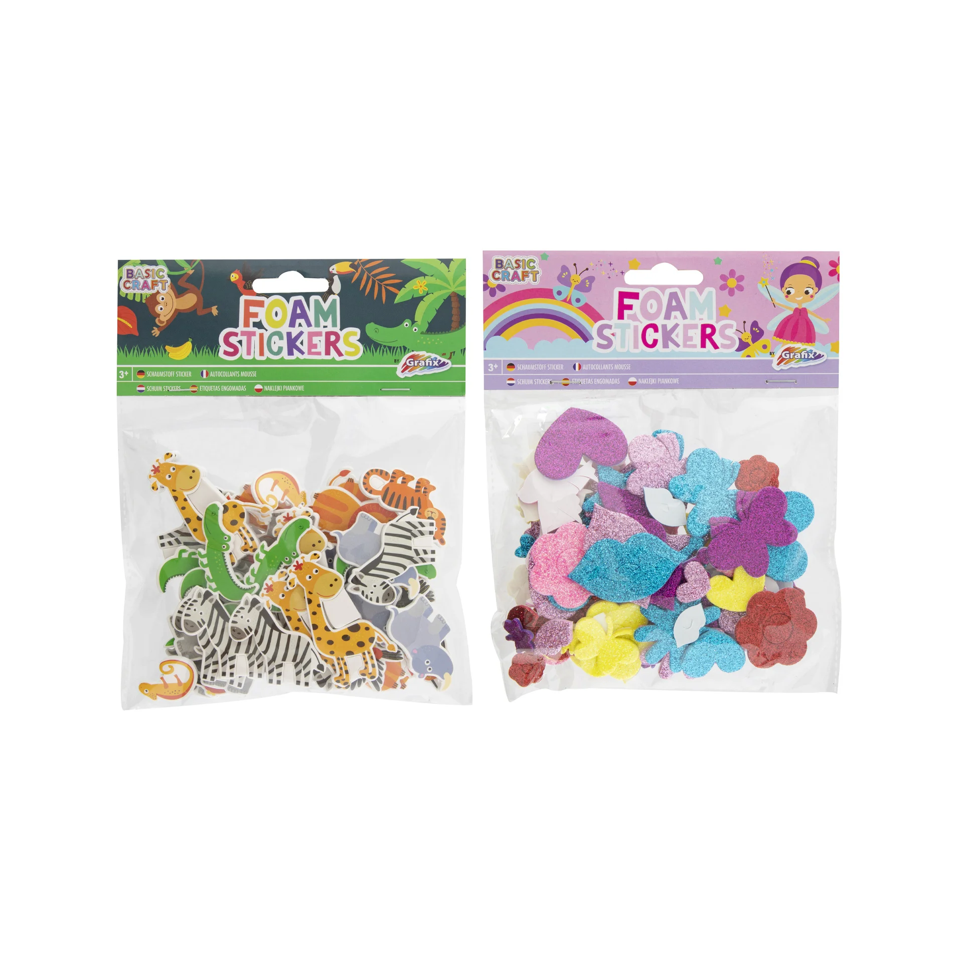 Комплектът съдържа 36 опаковки стикери от пяна "Джунгла" и 36 опаковки стикери от пяна "Принцеси".