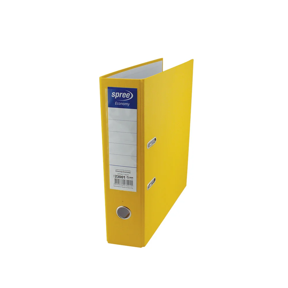 Класьор Economy А4, 75 мм, PP, жълт е класьор с корица от полипропилен и гръб с ширина 75 мм, предназначен за документи формат A4. Гръбът 75 мм осигурява възможност за съхранение на по-голям обем документи и улеснява подреждането на папки на рафт. Полипропиленовата корица предлага устойчивост на намачкване и ежедневна употреба в офисна или учебна среда. Жълтият цвят помага за бързото разпознаване и сортиране по тема или отдел. Подходящ е за организиране на фактури, договори, учебни материали и други важни файлове, като може да се етикетира на гърба за по-лесен достъп.