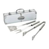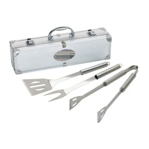 Комплектът за барбекю от неръждаема стомана включва лопата за скара, вилица и щипки в стоманено куфарче с дръжка.