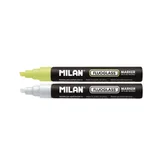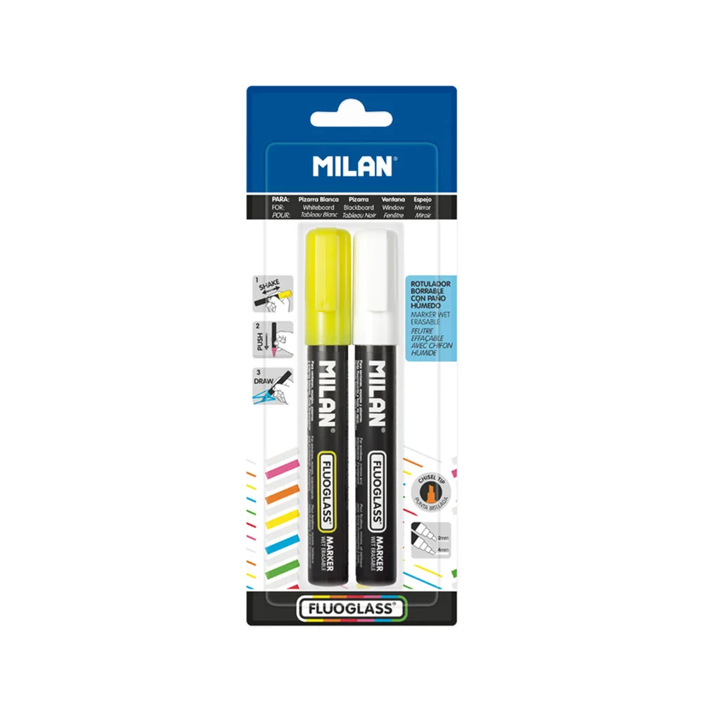 Milan Маркер Fluoglass, изтриваем, 2 броя в блистер, жълт и бял, опаковка 25