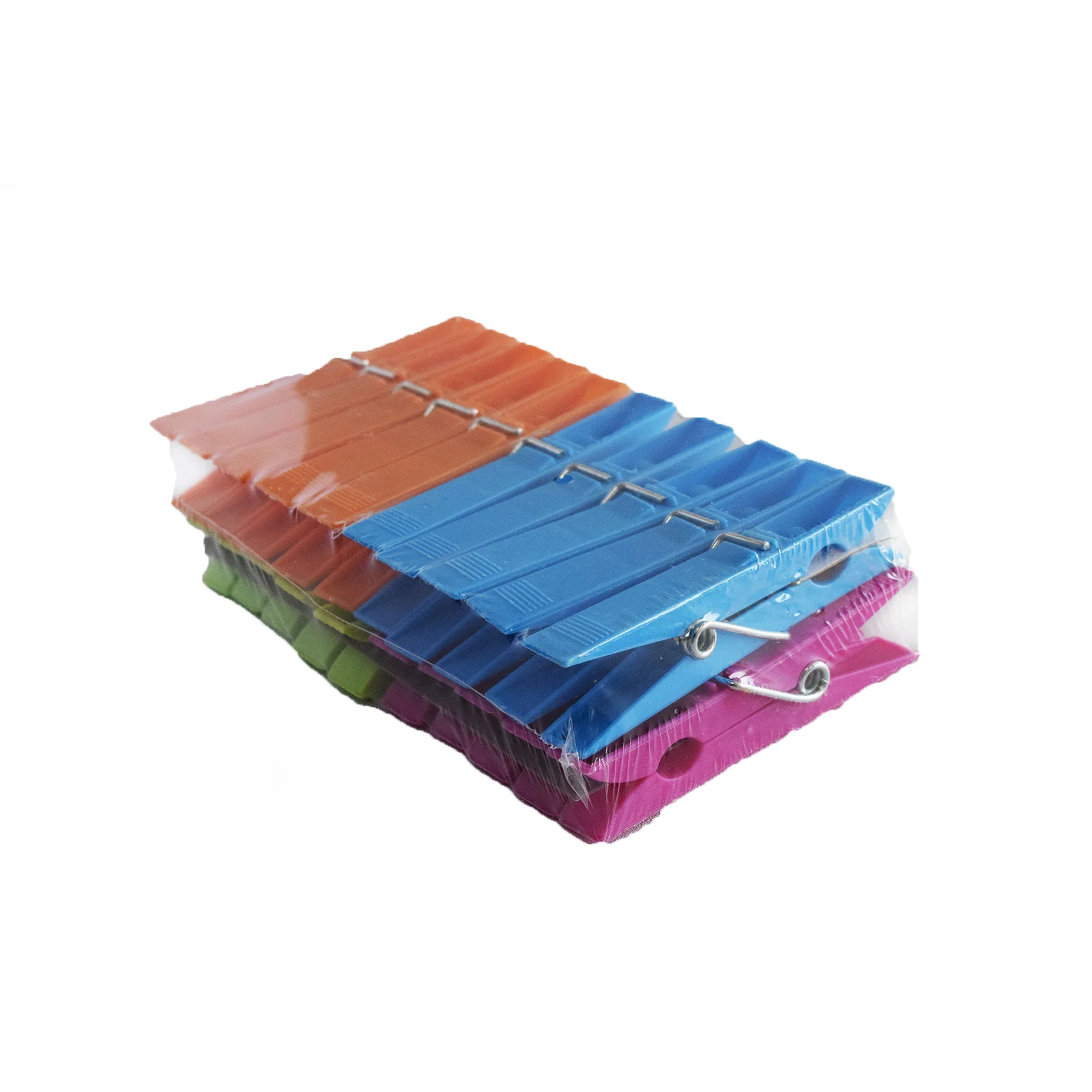 Комплект класически щипки за дрехи в четири ярки цвята (оранжев, зелен, розов и тюркоазен).