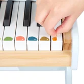 Включените стикери, които могат да се залепят върху клавишите, подкрепят младите музиканти с първите им песни.